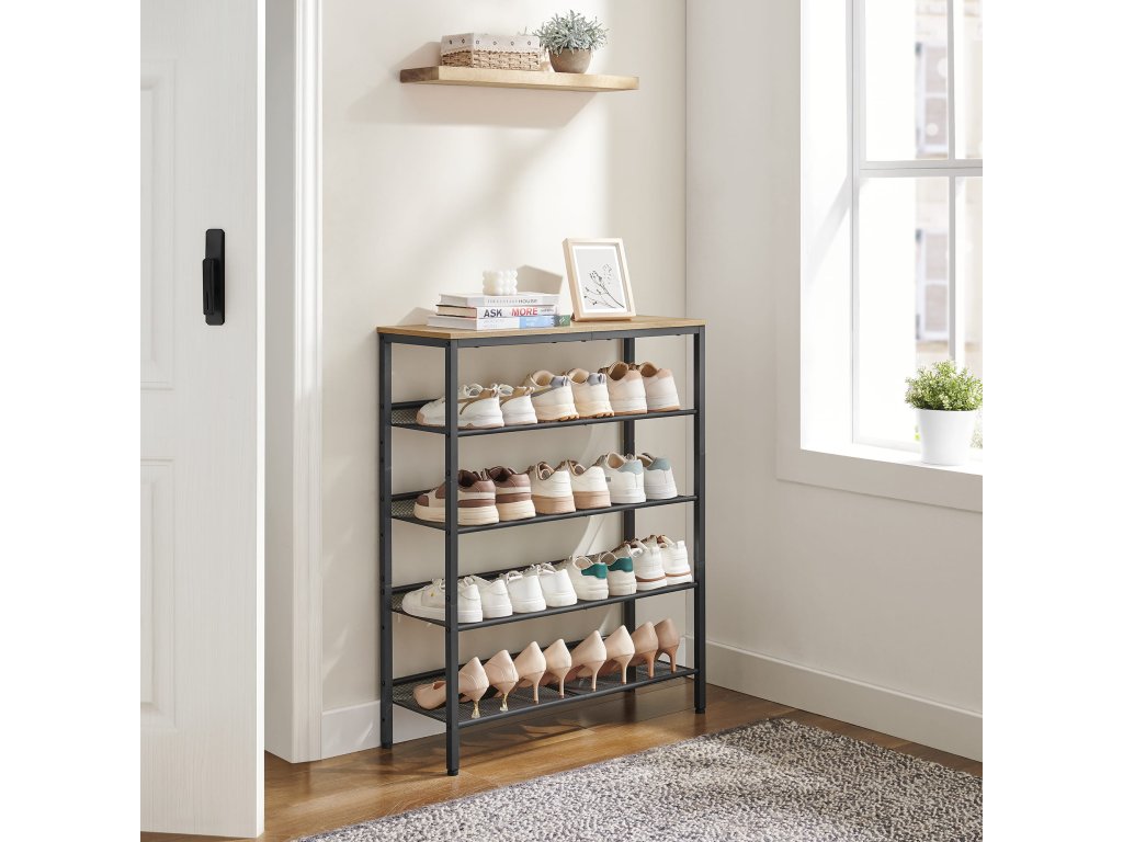 Univerzální a stylový botník nabízí víc než jen úložné místo pro vaši obuv. Díky svým čtyřem prostorným policím a pevné horní desce pojme nejen boty, ale také další doplňky nebo dekorace. Možnost volby sklonu polic vám umožní přizpůsobit botník přesně vašim potřebám – nakloněné police pro snadný přístup nebo rovné pro vyšší stabilitu uložených předmětů. Perforace polic podporuje cirkulaci vzduchu, což je ideální pro uchovávání obuvi v dobrém stavu. Nastavitelné nožičky zajišťují stabilitu i na nerovných podlahách, a elegantní kombinace dubového dekoru a černé oceli snadno zapadne do moderního interiéru. Tento botník lze využít také jako víceúčelový regál – třeba na knihy, květiny nebo jiné drobnosti. Perfektní volba pro každého, kdo hledá funkční a zároveň estetické řešení.