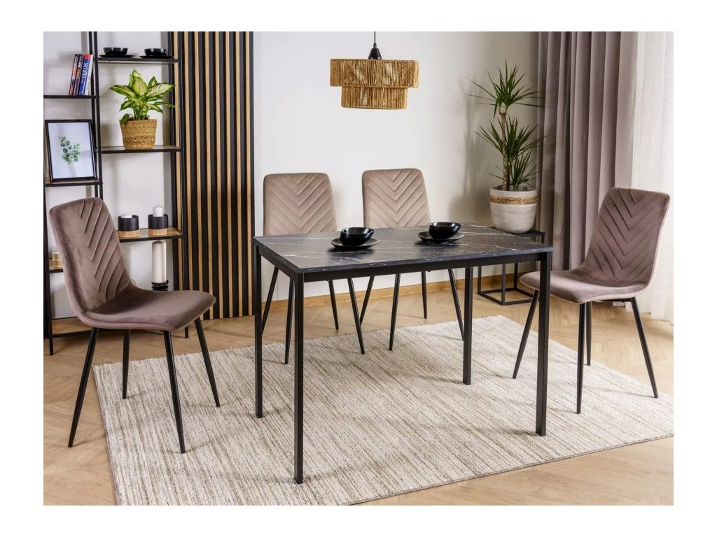 Moderní jídelní stůl RAMOD v rozměru 100 x 60 cm zaujme svým elegantním černým mramorovým dekorem. Deska z lamina je nejen stylová, ale i snadná na údržbu. Stabilní konstrukce z kovu zajišťuje pevnost a dlouhou životnost, díky čemuž je stůl vhodný pro každodenní používání.