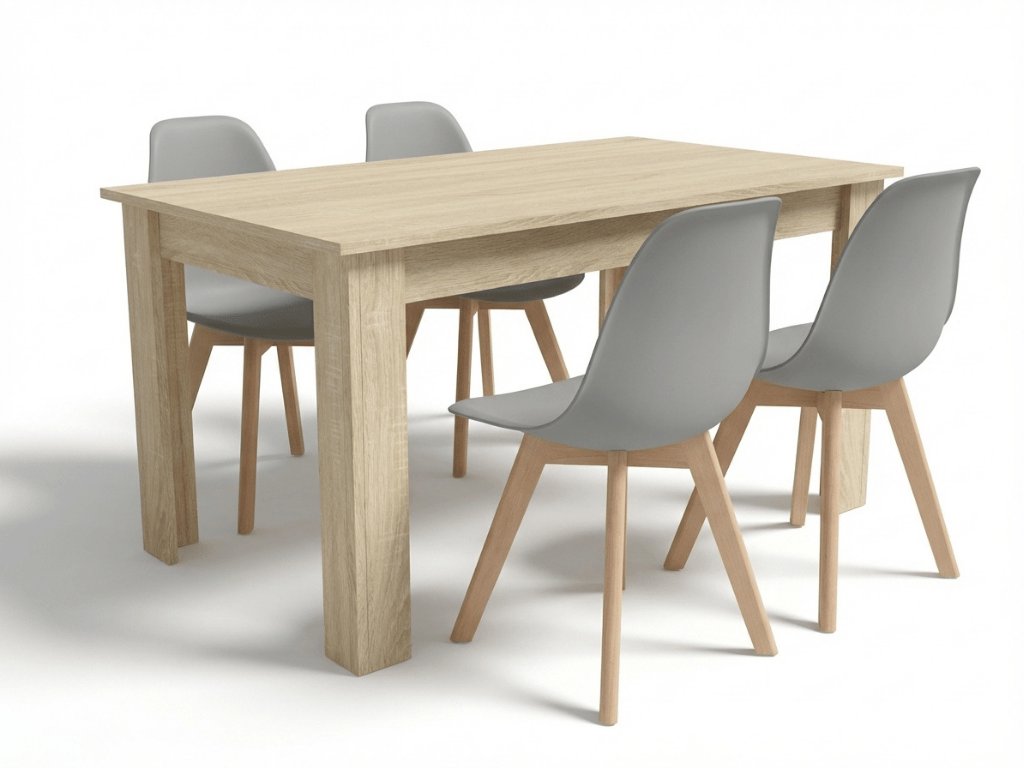 Tento jídelní set spojuje nadčasový vzhled s praktickým využitím v každodenním životě. Jemná šedá barva židlí v kombinaci s dekorem dub sonoma působí svěže a přirozeně. Je ideální volbou pro ty, kteří hledají harmonii, funkčnost a styl v jednom. Díky snadné údržbě a odolným materiálům si ho oblíbíte při každodenním stolování i slavnostních chvílích.