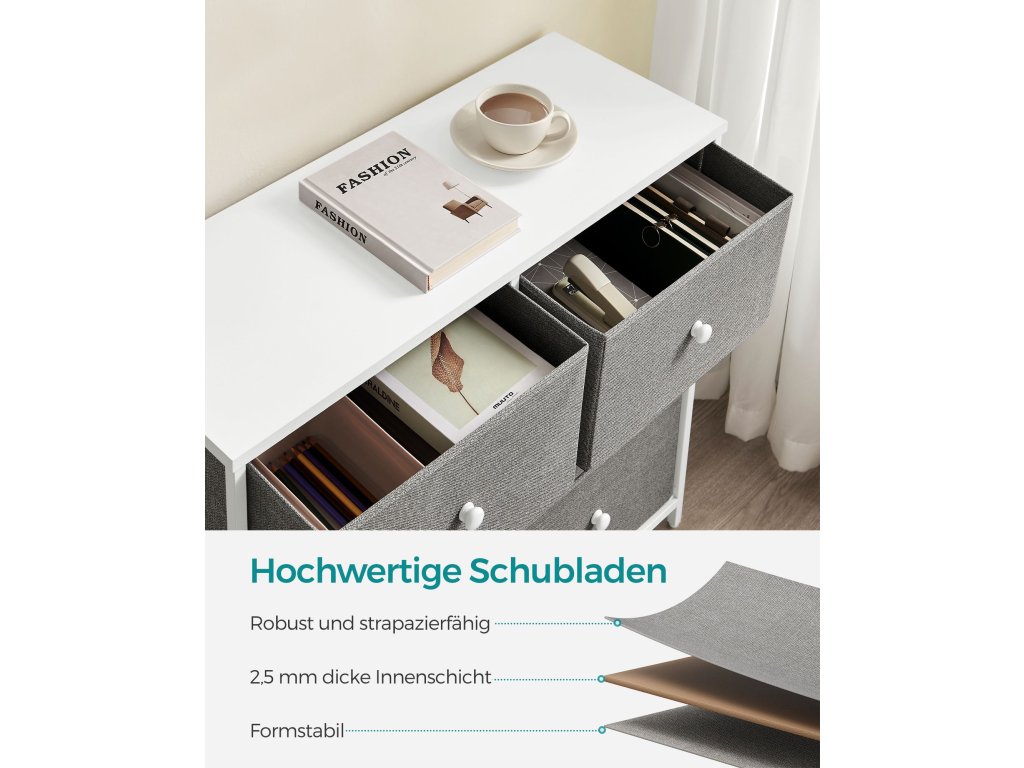 Tato stylová komoda v kombinaci šedé textilie a bílé konstrukce je ideálním řešením pro každodenní organizaci. Ať už ji postavíte do ložnice na spodní prádlo, do předsíně na doplňky nebo do dětského pokoje na hračky, vždy nabídne dostatek prostoru díky 6 prostorným zásuvkám. Díky své lehké konstrukci se snadno přesouvá, a přesto zůstává stabilní díky výztuhám a možnosti přichycení ke zdi. Elegantní vzhled a praktické využití z ní dělají ideální volbu pro každý domov.