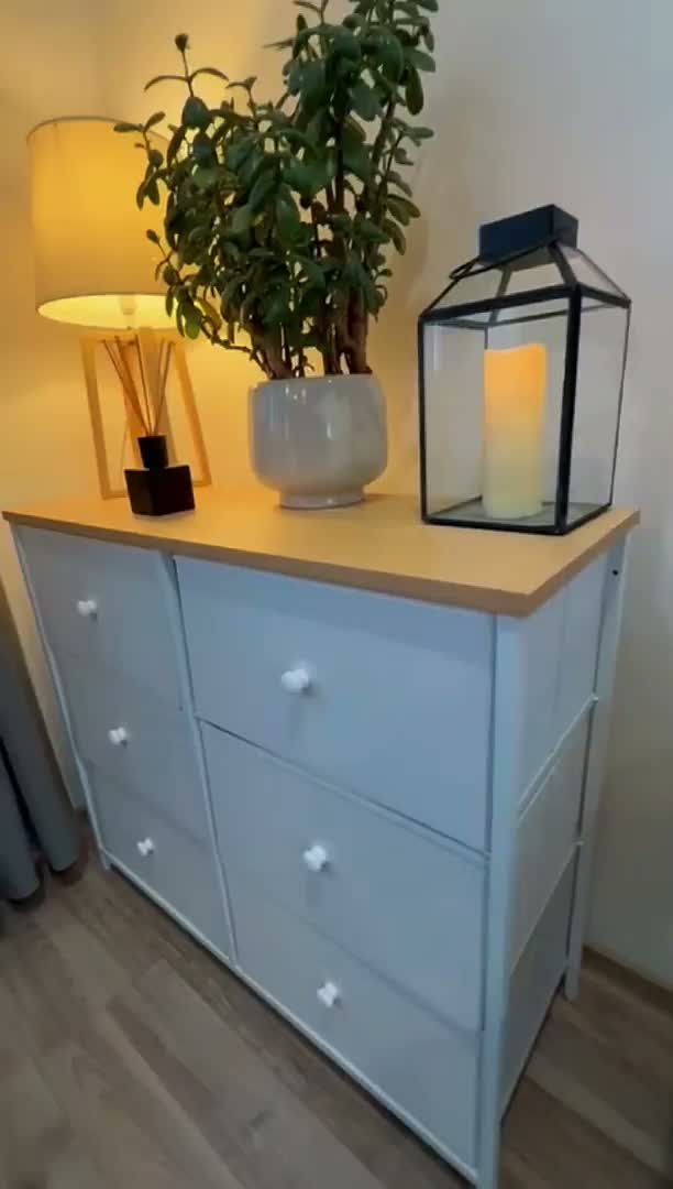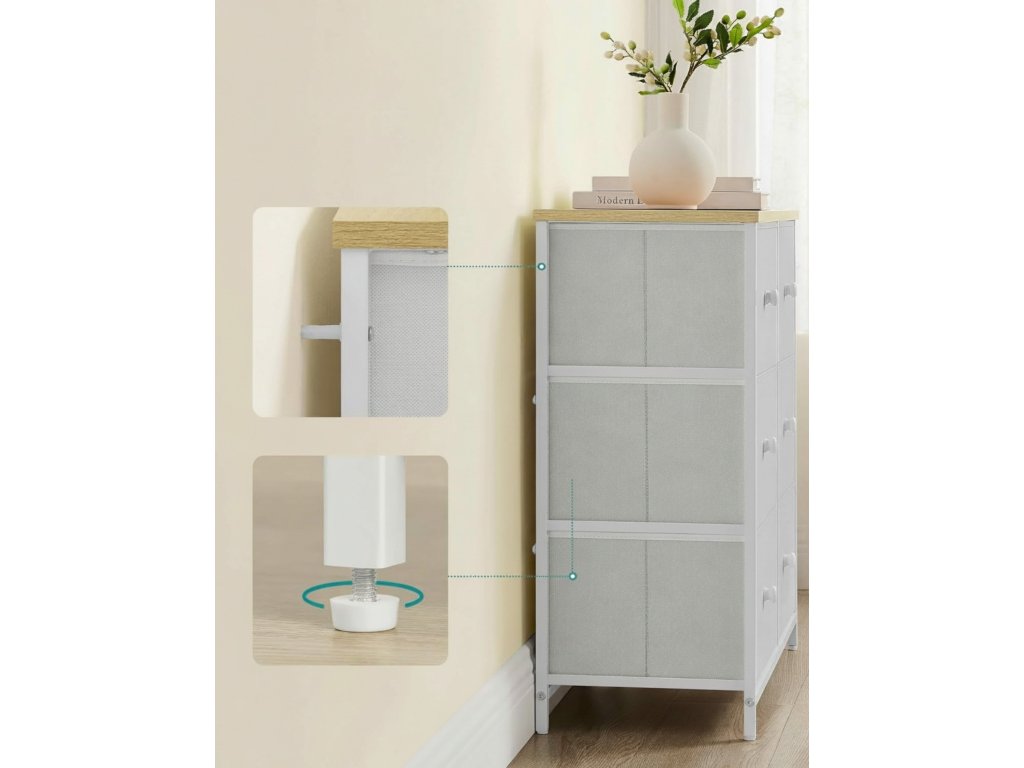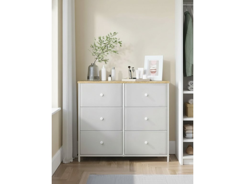 Tato stylová komoda v kombinaci bílé textilie a přírodního dekoru dubu je ideálním řešením pro každodenní organizaci. Ať už ji postavíte do ložnice na spodní prádlo, do předsíně na doplňky nebo do dětského pokoje na hračky, vždy nabídne dostatek prostoru díky 6 prostorným zásuvkám. Díky své lehké konstrukci se snadno přesouvá, a přesto zůstává stabilní díky výztuhám a možnosti přichycení ke zdi. Elegantní vzhled a praktické využití z ní dělají ideální volbu pro každý domov.