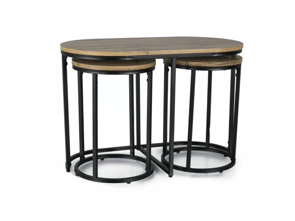 Tento set stolků přináší do interiéru svobodu uspořádání i moderní estetiku. Díky variabilnímu řešení můžete stolky snadno rozdělit, zasunout pod sebe nebo využít každý zvlášť přesně podle aktuální potřeby. Skvěle poslouží při odpočinku s kávou, setkání s přáteli i jako praktický prostor pro dekorace. Kombinace dřeva a kovu dodává prostoru útulnost i lehký industriální nádech, díky kterému se stane přirozenou součástí vašeho každodenního života.