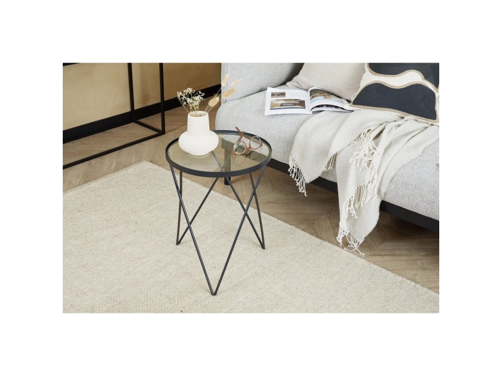 Příruční stolek EMILY v elegantním černém provedení a se skleněnou deskou je stylovým i praktickým doplňkem do každého interiéru. Díky svému lehkému, ale stabilnímu kovovému rámu působí vzdušně, přesto nabízí dostatek prostoru pro odložení knihy, kávy nebo dekorací. S průměrem 35,5 cm se skvěle hodí vedle pohovky, křesla nebo postele. Jeho nadčasový design vynikne ve stylu skandinávském, moderním i minimalistickém, a krásně se kombinuje s doplňky ve světlých tónech nebo naopak s výraznými barevnými akcenty.