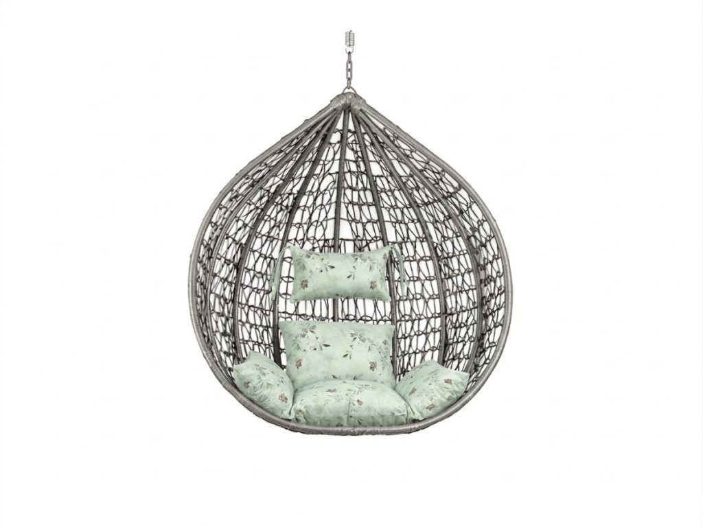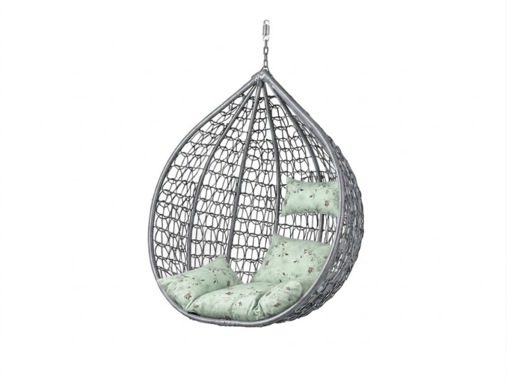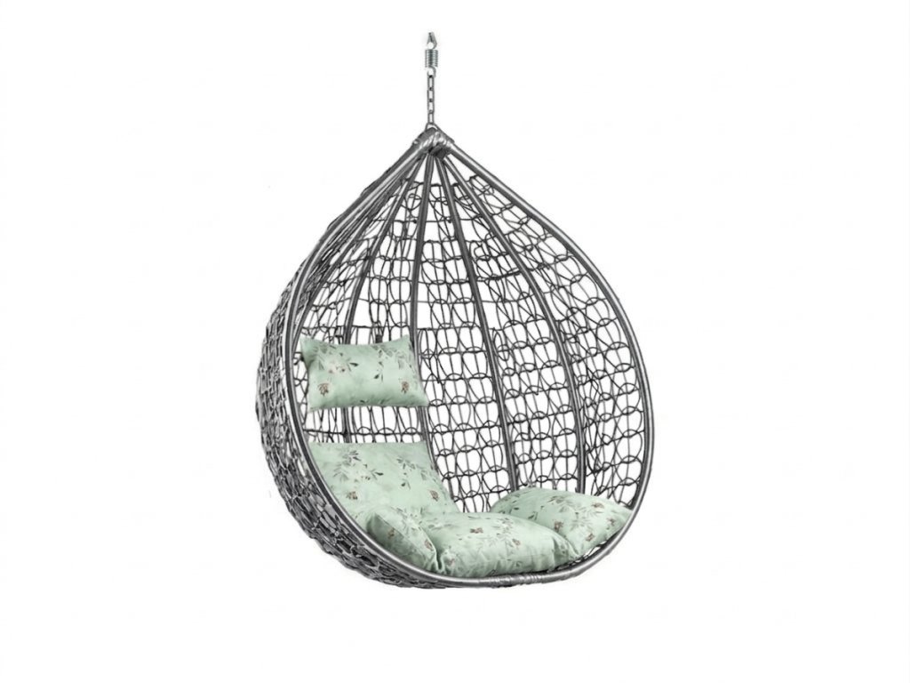 Šedé závěsné křeslo KOKON bez stojanu, světle zelený polštář se vzorem